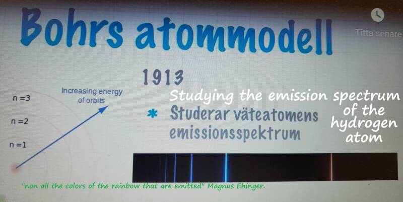 Strax efter Rutherfords modell (1911) uppkom Niels Bohrs atommodell (1913), som är en perfekt introduktion till kemins värld, då man vill förklara atomens uppbyggnad. Bohr var en forskare under Rutherford, och han insåg att det var ett vagt fokus på elektronernas rörelse och energi, och han själv valde att fokusera på att utveckla kvantmekaniken. Einstein har också forskat inom detta. Kvantmekanik har fått många forskare beroende, denna är kanske det viktigaste någonsin inom forskning? Den kommer vi inte förstå så lätt, men man kan börja med att förklara närliggande fenomen! Som 1) elektromagnetisk strålning, och 2) atomisk spektroskopi. Mikrovågor är exempel på elektromagnetisk strålning (som inte är joniserande strålning, den roterar istället molekyler och gör friktion mellan dem ---> värme). Våglängderna här kretsar ofta kring 1-80 cm, så de syns inte.