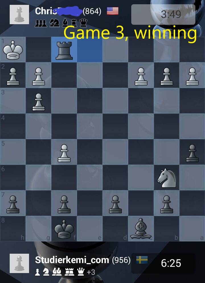 I can at least show some motivational quotes today. Quote #1. Learning time. It is important to have goals in life that are not too easy to achieve. Let the goals take time, don't be afraid of large time spans. Dream big. The trip is in many cases more fun than the destination, because there is a wonderful stimulation that should be put in focus. Quote #3. With all battles, there’s a meaning. Don’t be scared to death to lose in a situation. There is a day tomorrow also. When you don’t succeed during an experiment that’s an equally important lesson as what makes you win. Take in the information and memorize. Quote #4. Sit more alone and try to think about what is important in life. Why is that? Just try to think, without mimicking behaviors from others. Relax and use your intuition. I can show you one last thing before I end this post for today. I played chess during my travel earlier, and I can show you my 3 winnings (not when I lost). Best game of all times!