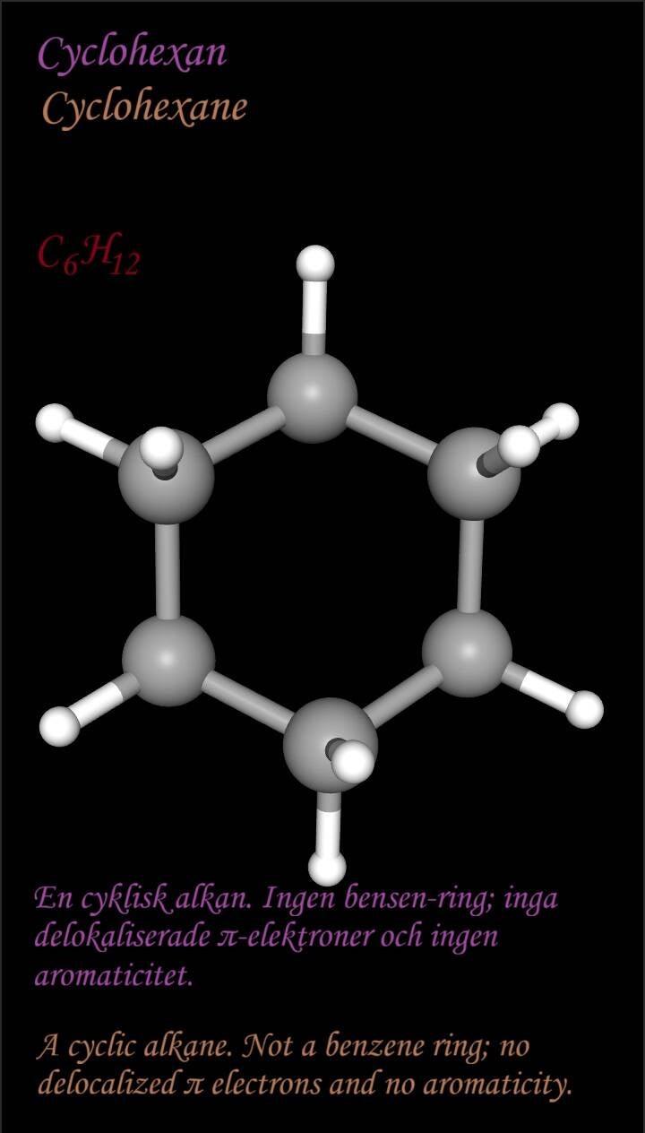 The synthetic opioid Tramadol, C16H25NO2, (morphine was a natural opioid) is produced from cyclohexanone (a ring molecule with the formula C6H10O), and through various chemical steps a cyclohexanol ring (an alcohol) is obtained, with chemical groups attached, e.g., a methoxyphenyl group, which affects many aspects of how the drug reacts in the body, and thanks to this, for example, both electron density and the binding process are influenced. But regarding the rings of morphine (it’s structure), as a comparison, there was instead for example, a simpler cyclohexene ring (C6H10, with only one double bond in the ring), and a cyclohexane ring (C6H12, a simple cycloalkane, with no double bonds in the ring). Regarding different naming conventions; 2 double bonds in the cycloalkane, which now becomes a cycloalkadiene → cyclohexadiene (C6H8). And 3 double bonds in the cycloalkane, which becomes a cycloalkatriene → cyclohexatriene (C6H6).