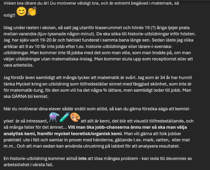 Today during the break at school, I sat outside the classroom and heard 19-year-old girls talking among themselves (I eavesdropped for a minute). They’re planning to apply to history programs for the autumn. I myself have been 19–20 and have actually considered the same path for a long time. Then I read various articles saying that 9 out of 10 don’t get jobs after, for example, history degrees or Swedish-teacher programs. You won’t get to work with what you wanted, as you thought you would, if you choose programs without mathematical components. You’ll end up as a receptionist or unemployed.