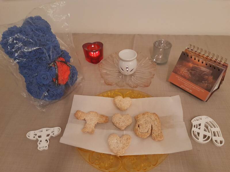 How was it to make these? It was fun, but it took time for someone who is not used to it. It was fascinating to see that you could roll rice balls and then boil them, and they kept the same shape. I had never made pastries with glutinous rice before. This one became my rescue as well when another recipe was about to go wrong. Instead of making hard square sesame bars, I chose to use two molds shaped like body organs, but the sesame and sugar did not want to hold the shape that I needed... So my emergency solution was to add glutinous rice flour, and just a tiny bit of water, and then everything started to hold together, thankfully (not a real recipe, though). So this is a lifesaver in the kitchen sometimes. You can see the finished baking result in the same picture as the blue teddy made of roses. The teddy is of course an unopened future gift for my Chinese boyfriend. And the cakes (like the other recipes) were in the oven at 175°C, until they became golden at the edges.
